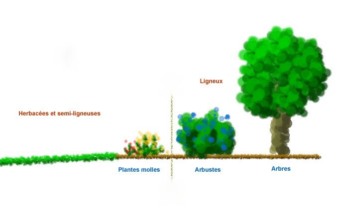 Dans le vivant, nous pouvons distinguer deux types de végétations. La végétation herbacée, dîte "plante molle" et la végétation ligneuse. La végétation herbacée est représenté dans les jardins par la presque totalité de la végétation basse telle que les gazons, les bulbes, les vivaces, les annuelles et les bisannuelles décoratives et naturelles. A quelques exception près, comme les graminées et les semi-ligneuses, la partie aérienne des plantes herbacées disparaît l'hiver.